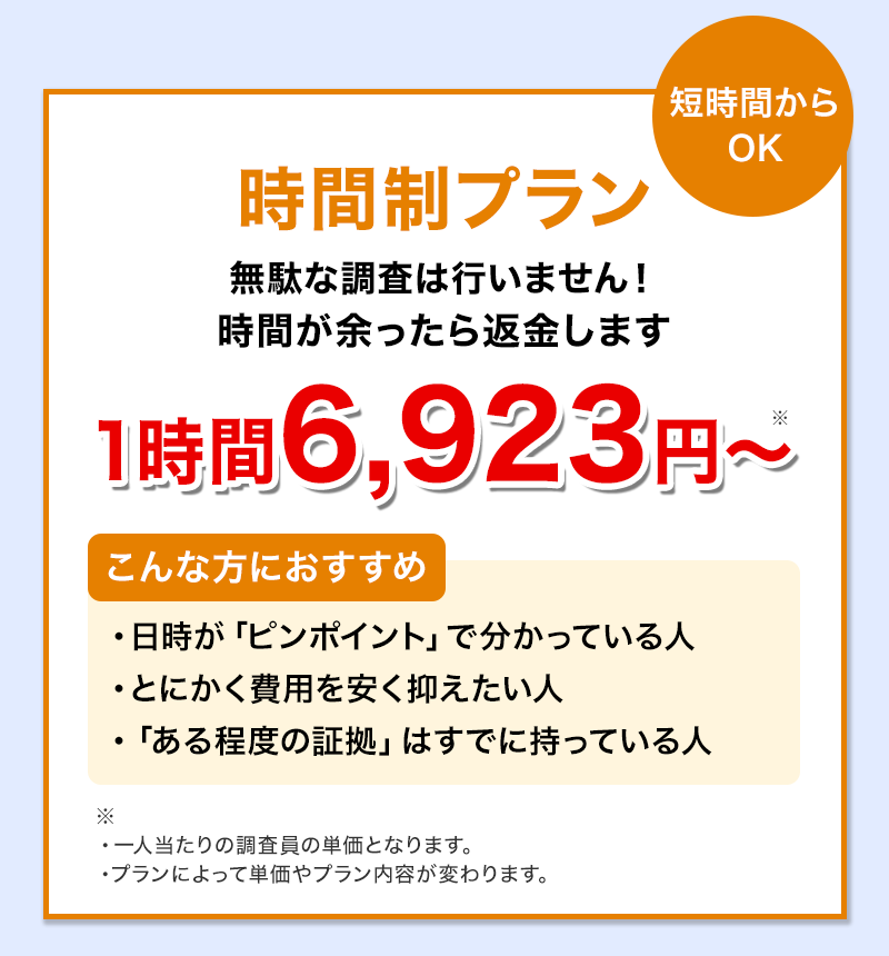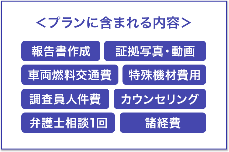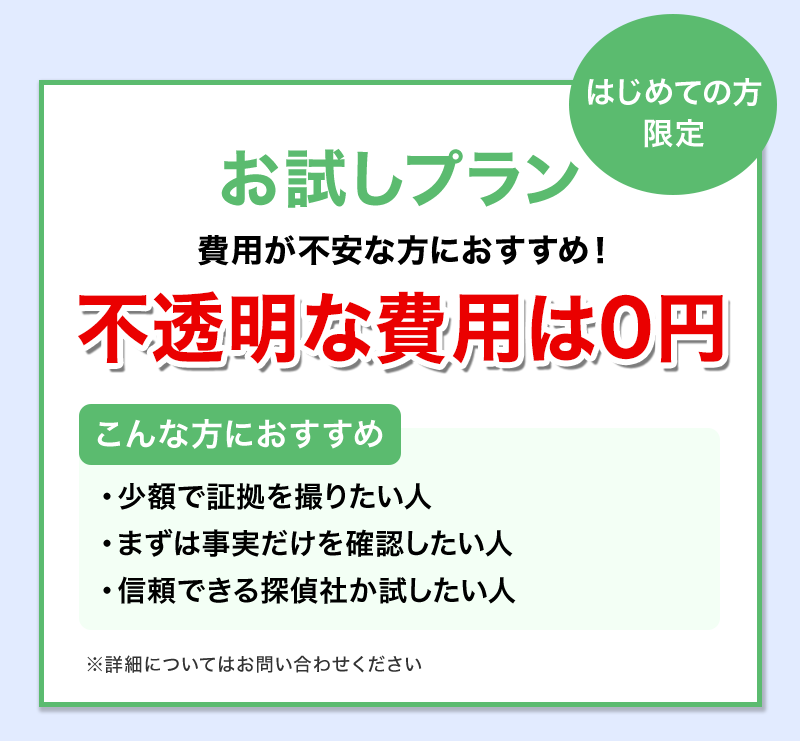 浮気調査に対して「いくらかかるかわからない」「後から高額請求されるのでは」という不安を持つ方は少なくありません。当探偵社では、お話をきちんとお伺いしたうえで、事前に調査内容・費用を明確にご説明。ご状況に合わない調査は提案しません追加費用が発生する調査は行いません。あなたの目的に必要な分だけ、無駄のない調査をご提案します。
