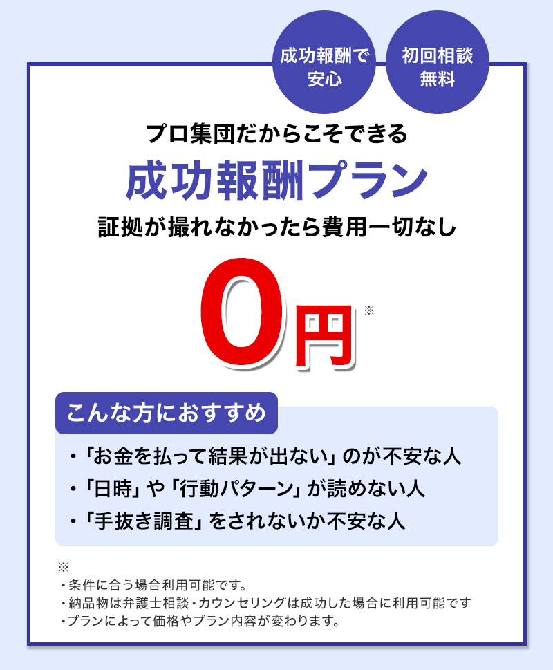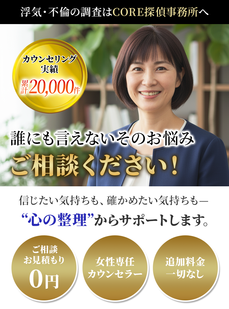 離婚するべきか慰謝料請求はできるのか今後どう動くのが最善か、証拠を手にしてからが本当の悩みの始まりです。当探偵社では、調査後に1ヶ月間のカウンセリングや弁護士への無料相談をご案内し、次の一手まで安心して進める体制を整えています。 -