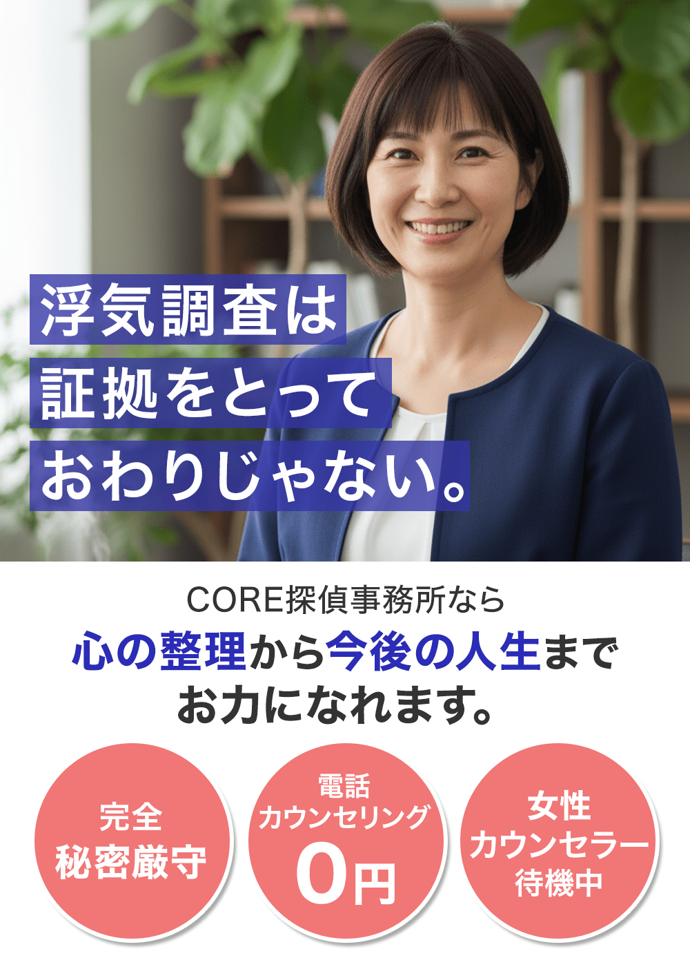 証拠を取るだけで終わらせず、その後の関係性や生活の立て直しまで伴走します。調査報告後は、弁護士による無料相談を1回ご利用可能。問題解決の「その先」まで見据えたサポートを提供いたします。